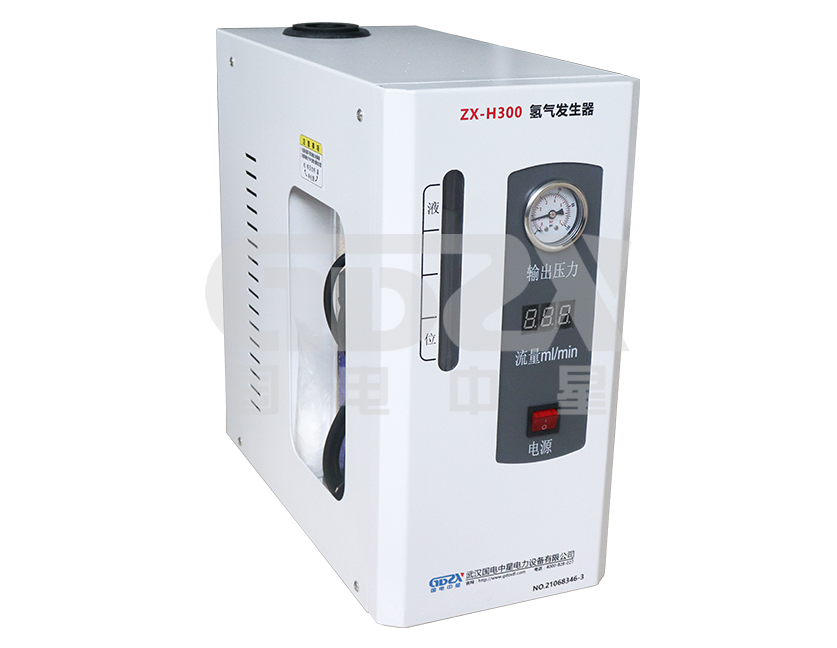 ZX-H300氫氣發生器主要有電解池單元、電氣控制元件(包括開關電源、壓力流量自動調節和流量顯示部分)、氣路單元(包括氣液分離裝置、壓力指示和氣體凈化)等部分組成。電解池為筒式結構,采用先進的膜滲透技術。工作原理為在電場的作用下,電解池陽極產生氧氣陰極產生氫氣,氧氣經液路被釋放到大氣中,而氫氣則進入凈化系統后輸出。